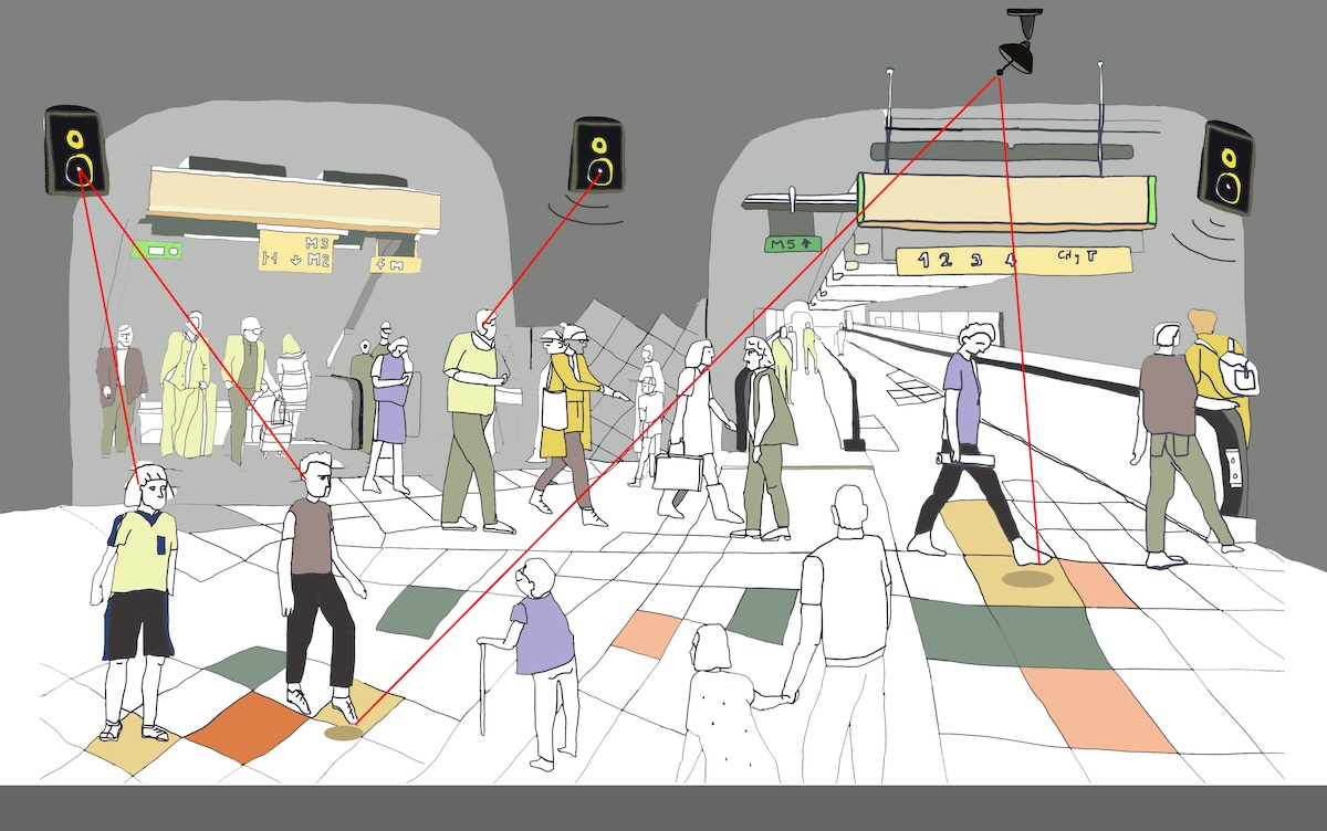 a public transit hub is equipped with hidden musical triggers. sound plays in speakers throughout the hall. curious travellers improvise a music piece together on their way to work.
