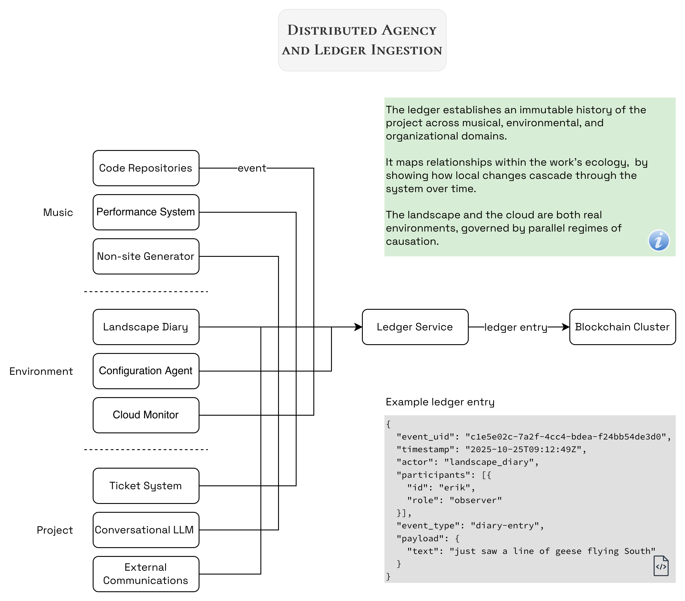 The project’s distributed agency and authorship is visualized by using a system of automated and semi-automated commits to a blockchain ledger. Changes and other events in any part of system’s ecology are appended, creating an immutable project history:
